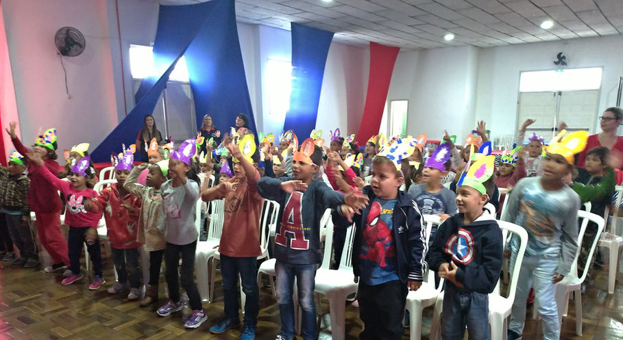 Os alunos do turno da matutino confeccionaram cestinhas com chocolates e os alunos do turno vespertino foram encarregados de recepcionar os 78 alunos da pré-escola e 1º ano da rede municipal com mimos e muito entusiasmo.